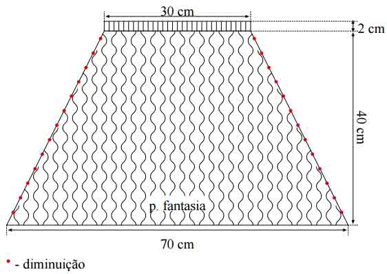 Correntinha (corr.). Ponto baixo (p. b.): introduza a ag. laç., puxe o p. e com outra laç., rem. todos os p.. Ponto alto (p. a.): laç., introduza a ag., laç., puxe o p. laç., rem., 2 p. e com outra laç., rem. todos os p.. Ponto fantasia 1, 2, 3, e 4: siga o gráfico correspondente. Detalhe da cava: siga o gráfico.