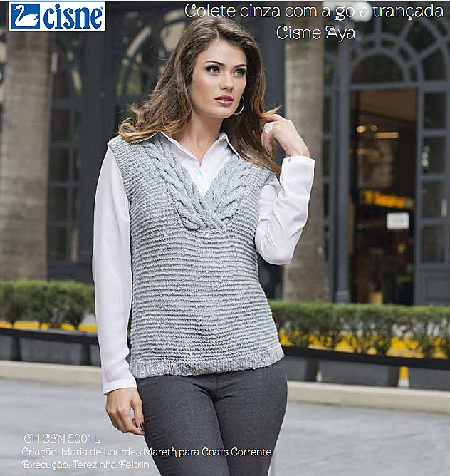 Para os dias de temperatura amena! Blusa em Crochê com a Lã Aya - Mais Brilho e Delicadeza aos seus trabalhos! Encontre no Armarinho São José! Bom trabalho! Material: Fio Cisne Aya (nov. de 100 g), 2 nov. na cor 00809 (cinza) Linha Camila (nov. de 1000m), 1 nov. na cor 01171 (cinza) Materiais adicionais: Ag. para crochê de aço niquelado Corrente Milward de 1,25mm Ag. para crochê de alumínio anodizado Corrente Milward de 3,5mm Ag. Tapestry Corrente Milward nº 118 Papel vegetal Lápis 3B Tesoura Abreviaturas e pontos empregados: Ag. – agulha, trab. – trabalhe, carr. – carreira, rep. – repita, v. – vezes, nov. – novelo, diag. – diagrama, corr. – correntinha, p.bx. – ponto baixíssimo, p.b. – ponto baixo, m.p.a. – meio ponto alto, p.a. – ponto alto; p.a.d. – ponto alto duplo, picô – 3 corr., 1 p.bx., laçando a 1ª corr.. Execução Transfira o molde para o papel vegetal para usar como referência na execução da peça. Costas – Com a ag. de crochê de 3,5mm e o Cisne Aya na cor cinza inicie a peça pela parte inferior com um cordão de 46cm em corr. sobre este cordão trab. acompanhando o diag. 1, os p. de rep. e o esquemas de medidas. Á 40cm desde o inicio faça os arremates para formar cavas raglan e decote. À 49cm desde o inicio arremate a peça e reserve. Frente – igual a parte das costas. Manga - Com a ag. de crochê de 3,5mm e o Cisne Aya na cor cinza inicie a cor cinza inicie a peça pelo punho com um cordão de 22cm em corr. sobre este cordão trab. acompanhando o diag. 1, os p. de rep. e o esquemas de medidas. Á 38cm desde o inicio faça os arremates nos dois lados da peça para formar a manga raglan. Siga o esquema de medidas. Á 47cm desde o inicio arremate a peça. Faça a outra manga igual e reserve-as. Pala – Com a ag. de crochê de 1,25mm e o fio Camila na cor cinza inicie o square com 8 corr., 1 p.bx. para fechar o arco. 1ª carr.: 1 corr., 16 p.b., 1 p.bx. para fechar a carr.. Da 2ª até a 5ª carr. continue seguindo o diag. 2. Rep. este motivo por mais 13 vezes e uni-los entre si com p.bx. para formar a pala frente e costas. Após o termino desta etapa trab. ao redor dos squares o bico de acabamento acompanhando o diag. 3 e o p. de rep.. Arremate o fio e reserve a peça. Montagem e acabamento – Com a ag. Tapestry nº 122 feche as mangas e costures nas cavas (9cm), feche as laterais (40cm). Mude para a ag. de crochê de 1,25mm e para o fio Camila na cor cinza, trab. ao redor do decote o bico de acabamento acompanhando o diag. 4 e o p. de rep.. Ao fazer a 2ª carr. vá prendendo a pala ao redor do decote com os p.b. da carr.. Receita e imagens: Coats Corrente |